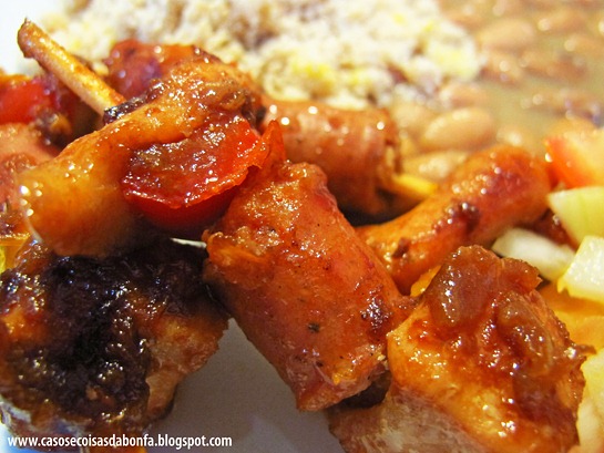Quando a carne ficou bem douradinha, minha mãe retirou os espetinhos da panela e os serviu acompanhados de molho à campanha, farofa de ovos e feijão manteiga.