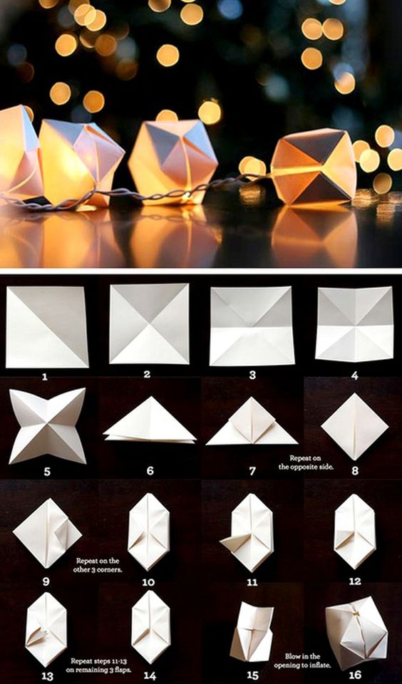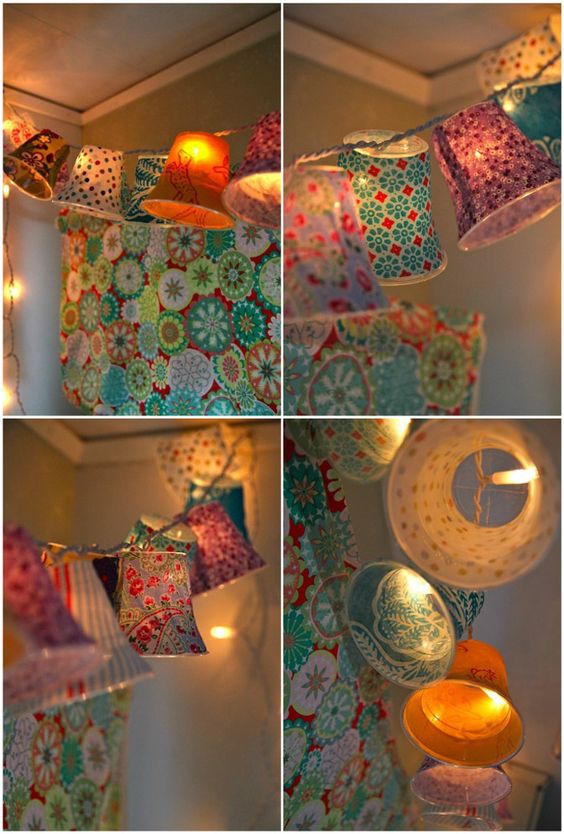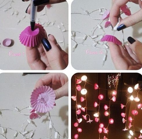 EVA, papel estruturado e tecido fino e transparente podem ser usados em seus artesanatos que usam pisca-pisca. Recorte formatos desejados, como borboletas e gatinhos e cole duas partes, mantendo a lâmpada do pisca-pisca no meio, com a ponta para fora. Ou faça dobradura com papel mais fino.